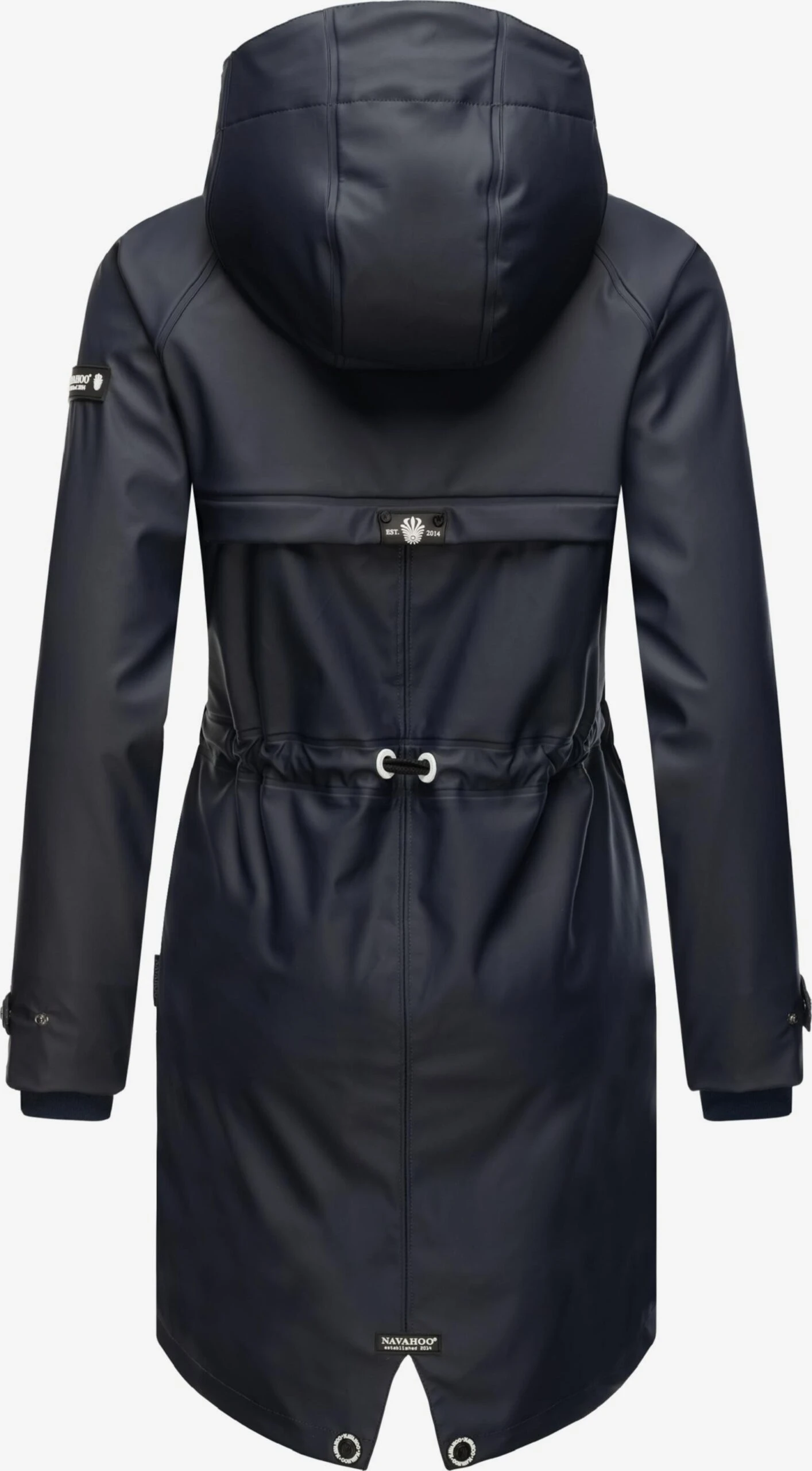 EffenRegenjasDrukknopenSplitCapuchon met trekkoordRaglanmouwenGeribd ceintuurtjeVerborgen ritsGladde stofLabel printMetalen oogjesLicht gevoerdRitssluiting