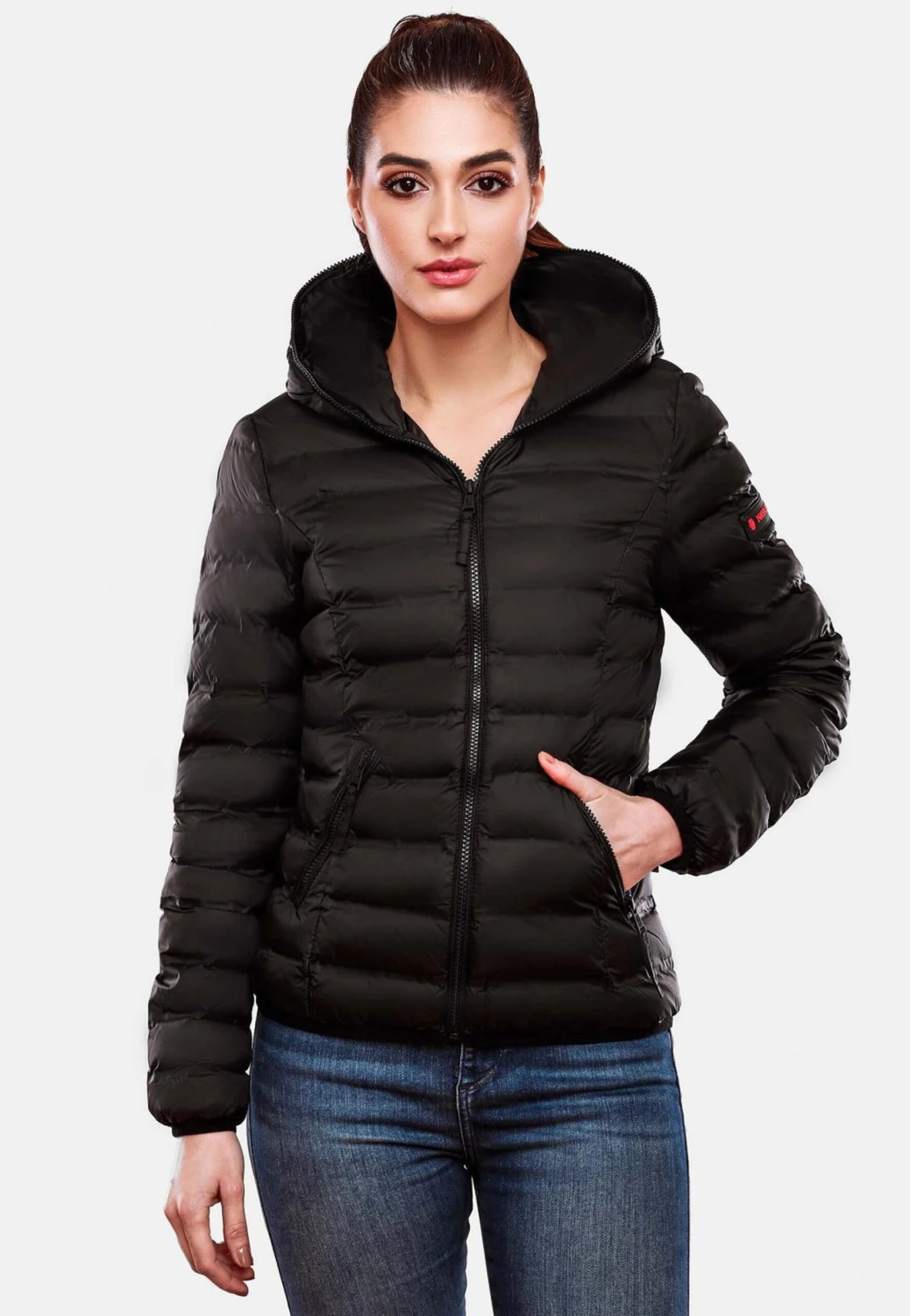 EffenGewatteerde jasRitssluitingIngelegde zoom/randMet capuchonRitszakken aan de zijkantLabel patch/label flagOp staal nadenGladde stofLicht gevoerdRitssluiting